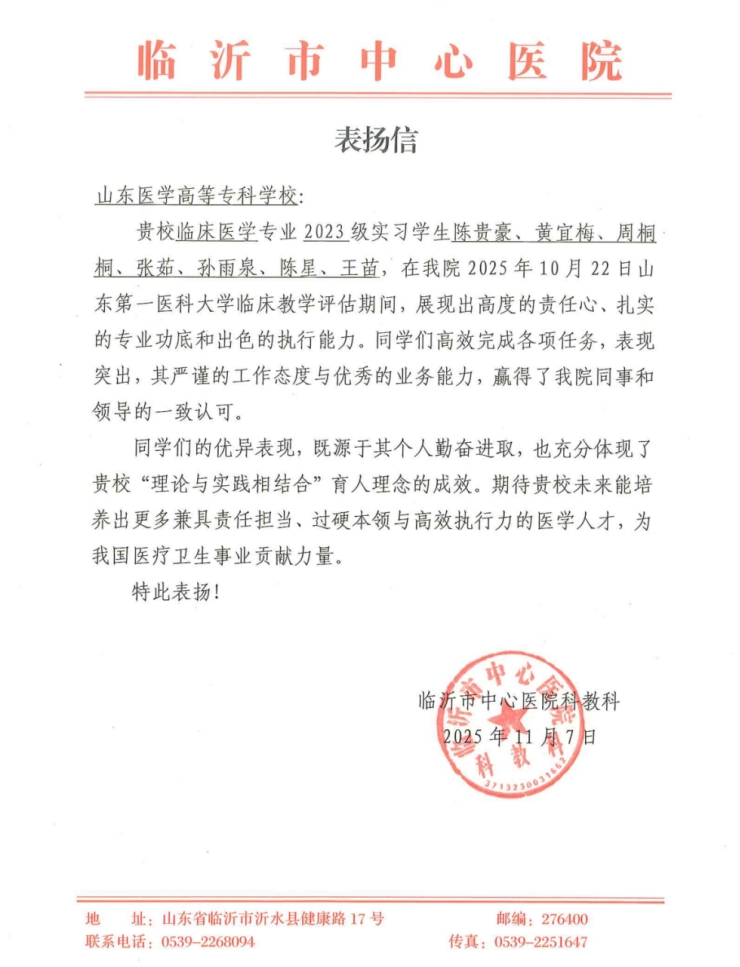 近日,山东医学高等专科学校收到临沂市中心医院发来的表扬信,对我校2023级临床医学专业陈贵豪、黄宜梅、周桐桐等7名实习学生给予表扬。