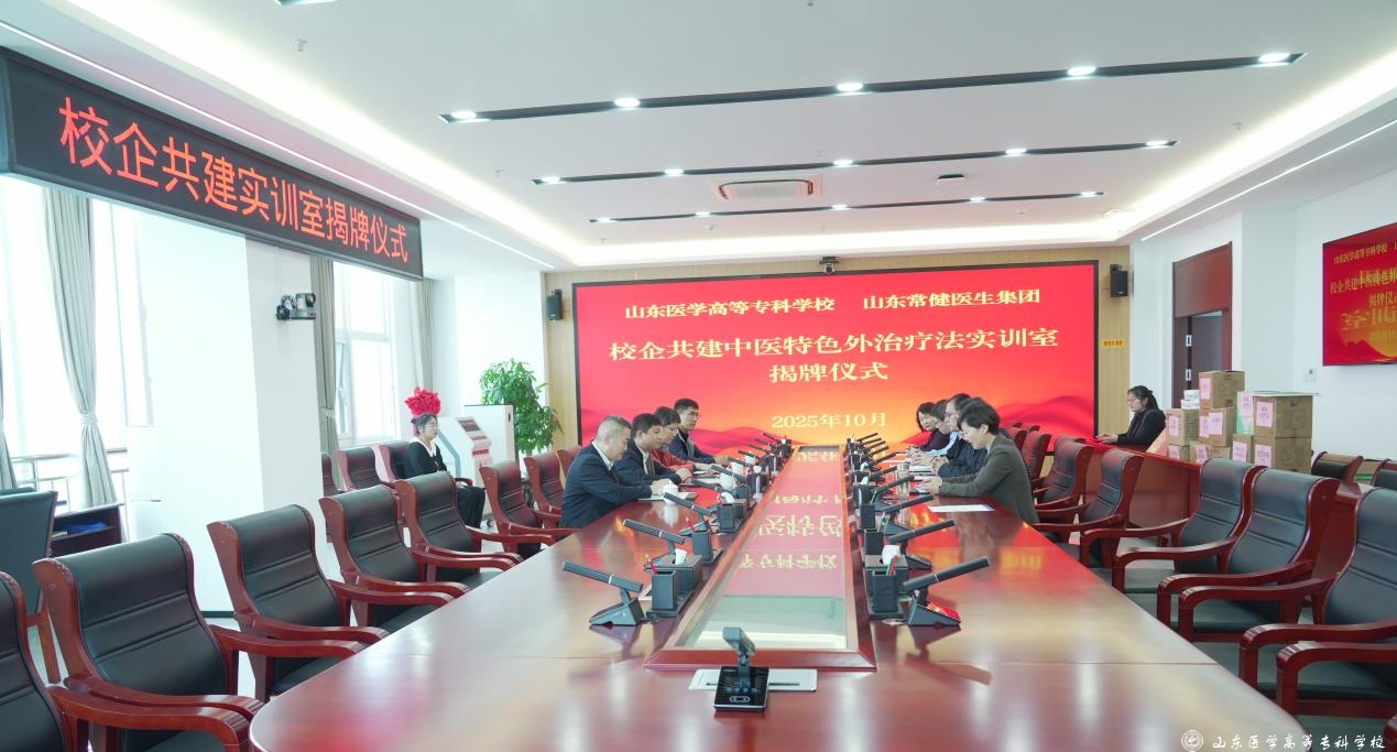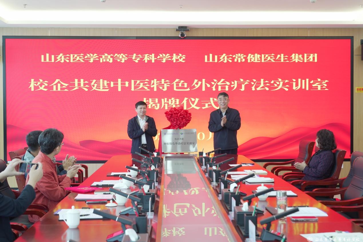 10月16日,山东医学高等专科学校与山东常健医生集团举行校企共建中医特色外治疗法实训室揭牌仪式。学校党委书记葛永宏、山东常健医生集团董事长黄金刚分别致辞,学校党委委员、副校长孙运粉主持仪式。