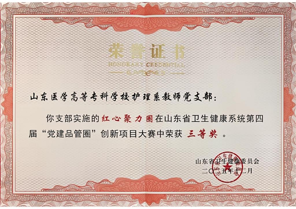 近日,山东省卫生健康系统第四届“党建品管圈”创新项目大赛决赛在济南举行,87个项目同台竞技,山东医学高等专科学校护理系教师党支部创新项目“红心聚力圈”获三等奖,学校获优秀组织奖。
