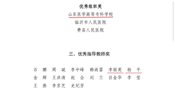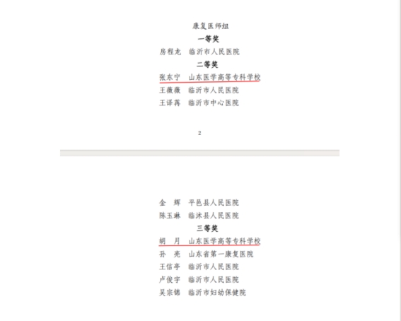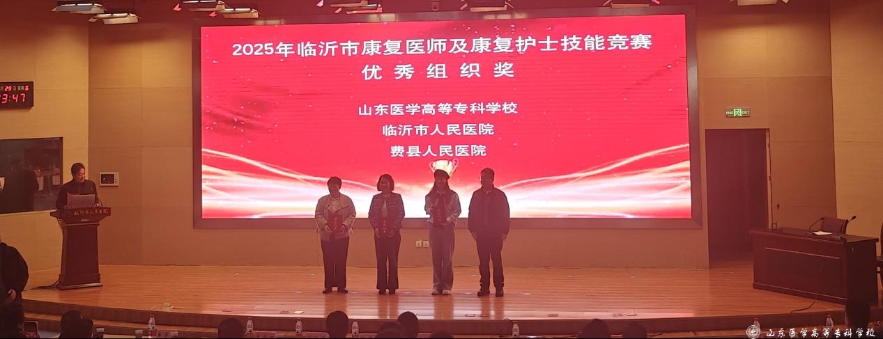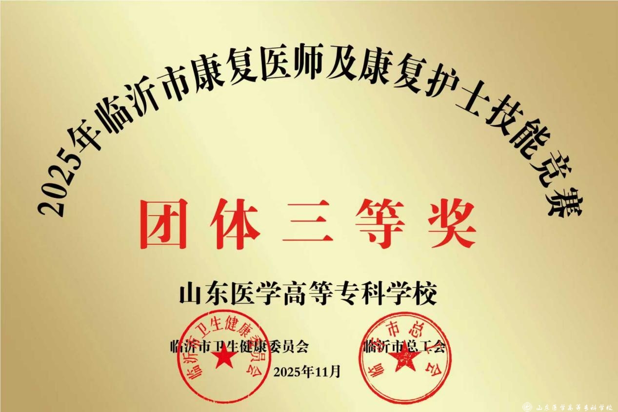 近日,山东医学高等专科学校在2025年临沂市康复医师及康复护士技能竞赛中取得佳绩。我校康复医学教师团队荣获团体三等奖,选手张东宁、胡月分获个人二等奖、三等奖,李丽英、柏平两位教师获评优秀指导教师,学校获优秀组织奖。