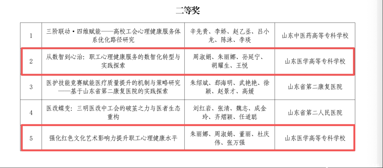 近日,山东省卫生健康委员会直属机关工会委员会公布2025年度工会研究课题评选结果,山东医学高等专科学校推送的4项课题荣获二等奖2项,三等奖2项。