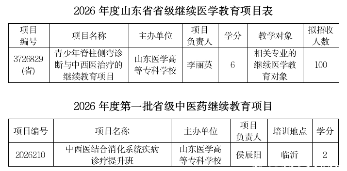 近日,山东省卫生健康委员会公布2026年省级继续教育项目立项名单,山东医学高等专科学校健康与康复系李丽英教授、侯辰阳副教授牵头的“青少年脊柱侧弯诊断与中西医治疗的继续教育项目”和“中西医结合消化系统疾病诊疗提升班”2个项目成功获批。