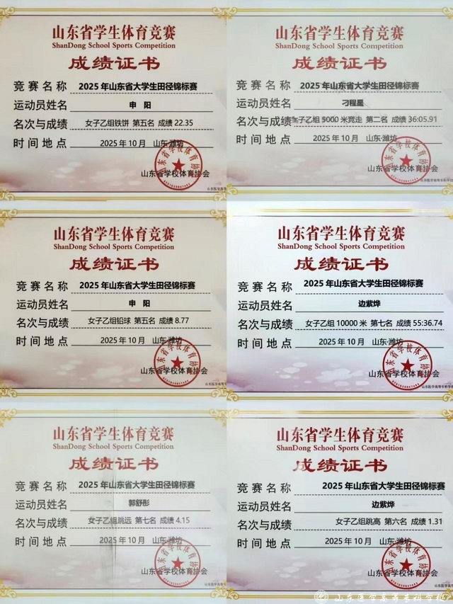 10月8日至14日,由山东省学校体育协会主办的2025年山东省大学生田径锦标赛在潍坊奥林匹克体育公园举行。我校10名运动员组成田径代表队参加比赛,并斩获多项荣誉。