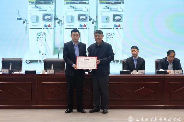 仪式上,马强与苏伟共同为“就业育人产学研合作基地”揭牌。威高集团向学校捐赠了教学用透析设备,并为订单班学生开展企业文化专题讲座。