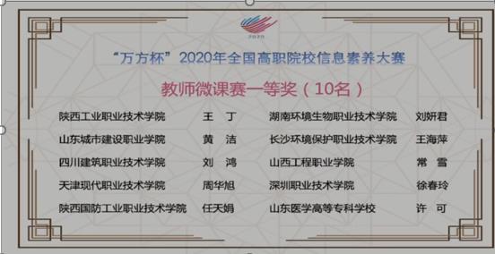 近日,由教育部高等学校图书情报工作指导委员会高职高专院校分委员会主办的“万方杯”2020全国高职院校信息素养大赛闭幕,我校师生获得全国一等奖1项和全省二等奖11项、三等奖14项和优秀奖1项的优异成绩。