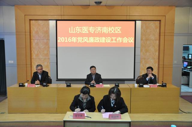 会上,纪委阎希青书记传达学习了中共十八届中央纪委六次全会、中共山东省纪委十届七次全会和省卫生计生委2016年党的建设暨党风廉政建设工作会议精神,部署了学校2016年党风廉政建设工作。党委副书记、校长周天增(主持党委工作)和校区班子成员代表、分管领导和党总支、部门负责人代表逐级签订了党风廉政建设责任书和勤政廉政责任书。工作人员宣读了党员干部廉洁自律承诺书。