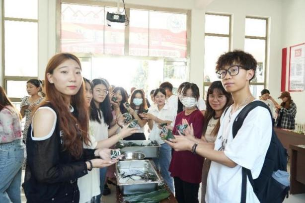 餐厅师傅早早做好准备,碧绿飘香的粽叶,雪白洁净的糯米,晶莹剔透的蜜枣……餐厅师傅带领学生们卷起粽叶、填上糯米、放上馅料、系上棉绳,将传统文化“包”进粽子里,让大家更近距离感受传统文化的独特魅力,增强了学生爱国爱乡的情感。