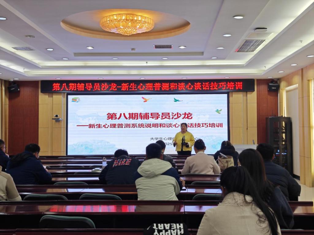 为进一步规范新生心理普测流程,强化辅导员心理约谈与谈心谈话的专业能力。近日,学生工作处(武装部)大学生心理健康教育中心在1号楼一楼会议室组织开展了第八期辅导员沙龙,主题为“新生心理普测系统说明与谈心谈话技巧培训”。2025级全体辅导员参加了此次培训。