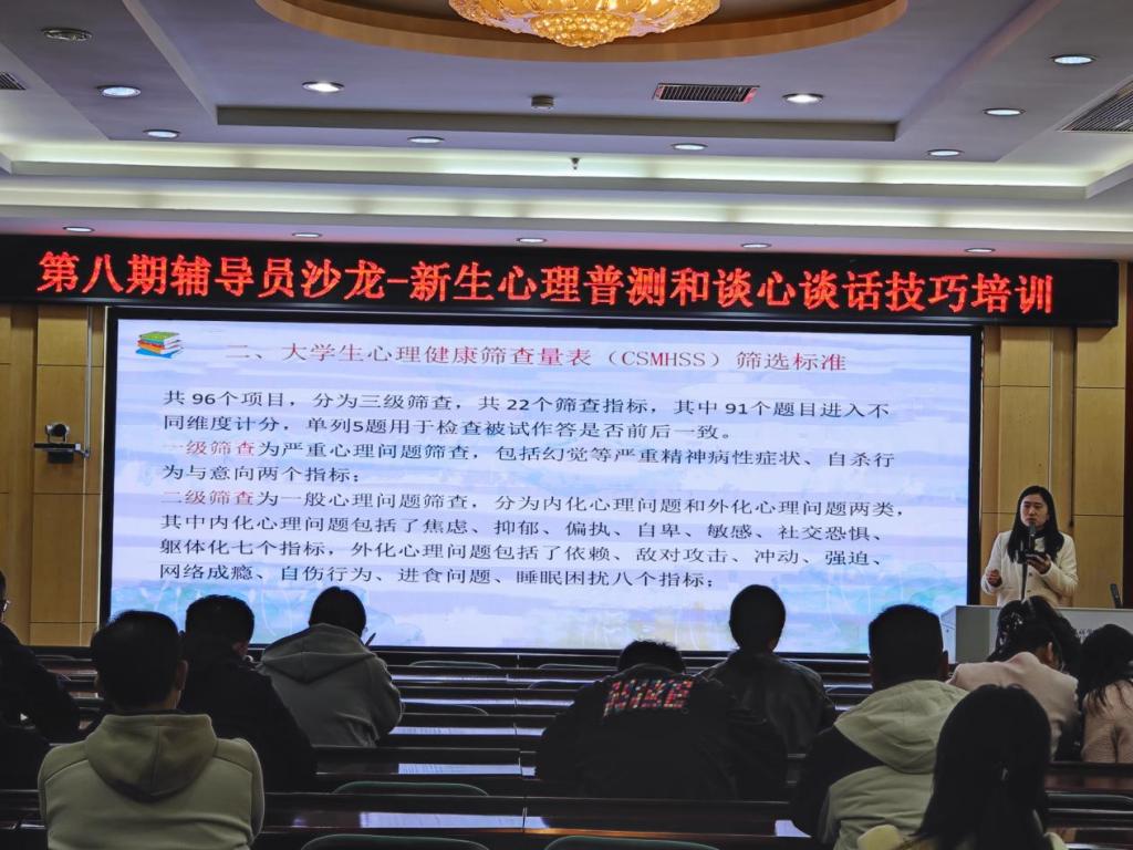 培训伊始,学生工作处(武装部)副处长杨敏强调了谈心谈话在学生工作中的基础性作用,指出辅导员是学生健康成长的重要引路人,提升其心理识别与沟通能力至关重要。培训围绕三大板块展开:一是新生心理普测及统计工作的具体流程与注意事项;二是对《大学生心理健康筛查量表(CSMHSS)》的筛查标准与结果解读进行详细说明,涵盖三级筛查机制及其应用场景;三是重点讲解了心理约谈的意义、程序与技巧,包括如何建立信任、评估风险、提供支持及资源链接等。培训强调,辅导员在约谈中应注重共情倾听、避免贴标签,并严格保护学生隐私,做到科学干预与人文关怀并重。