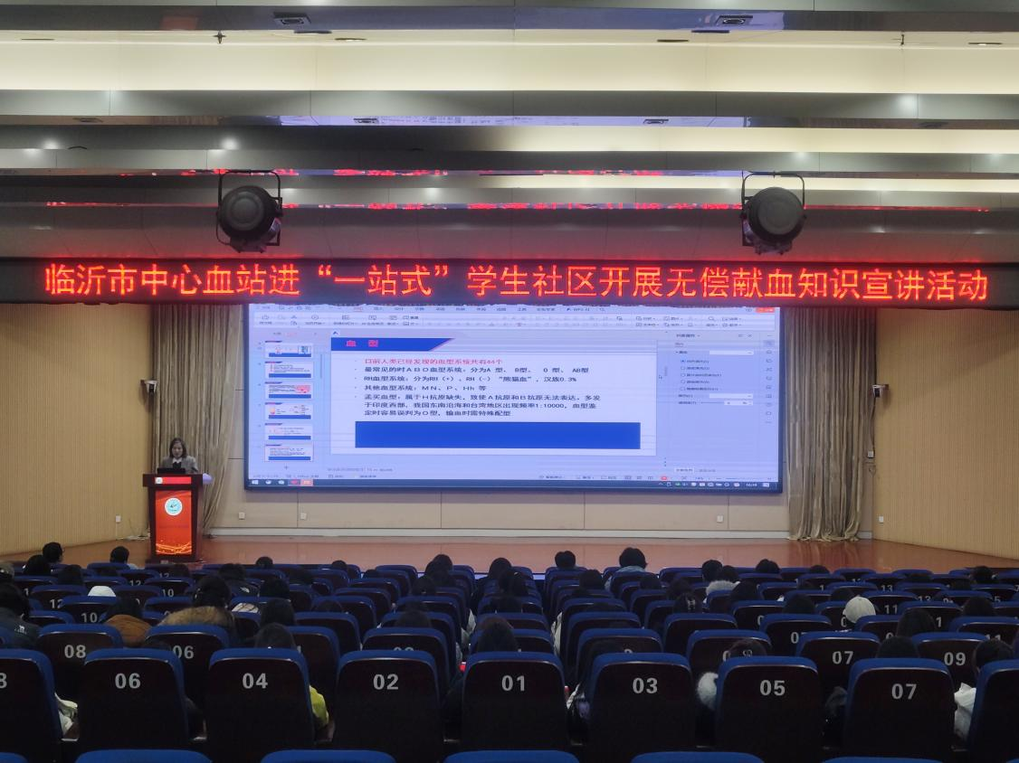 为进一步普及无偿献血科学知识、弘扬无私奉献精神,12月17日,临沂市中心血站携手我校医学检验系与“一站式”学生社区,在学校行政楼二楼报告厅成功举办了一场无偿献血知识科普活动。讲座特邀临沂市中心血站的刘西芳科长和医学检验系的姚远副教授主讲,辅导员及学生代表参加活动。