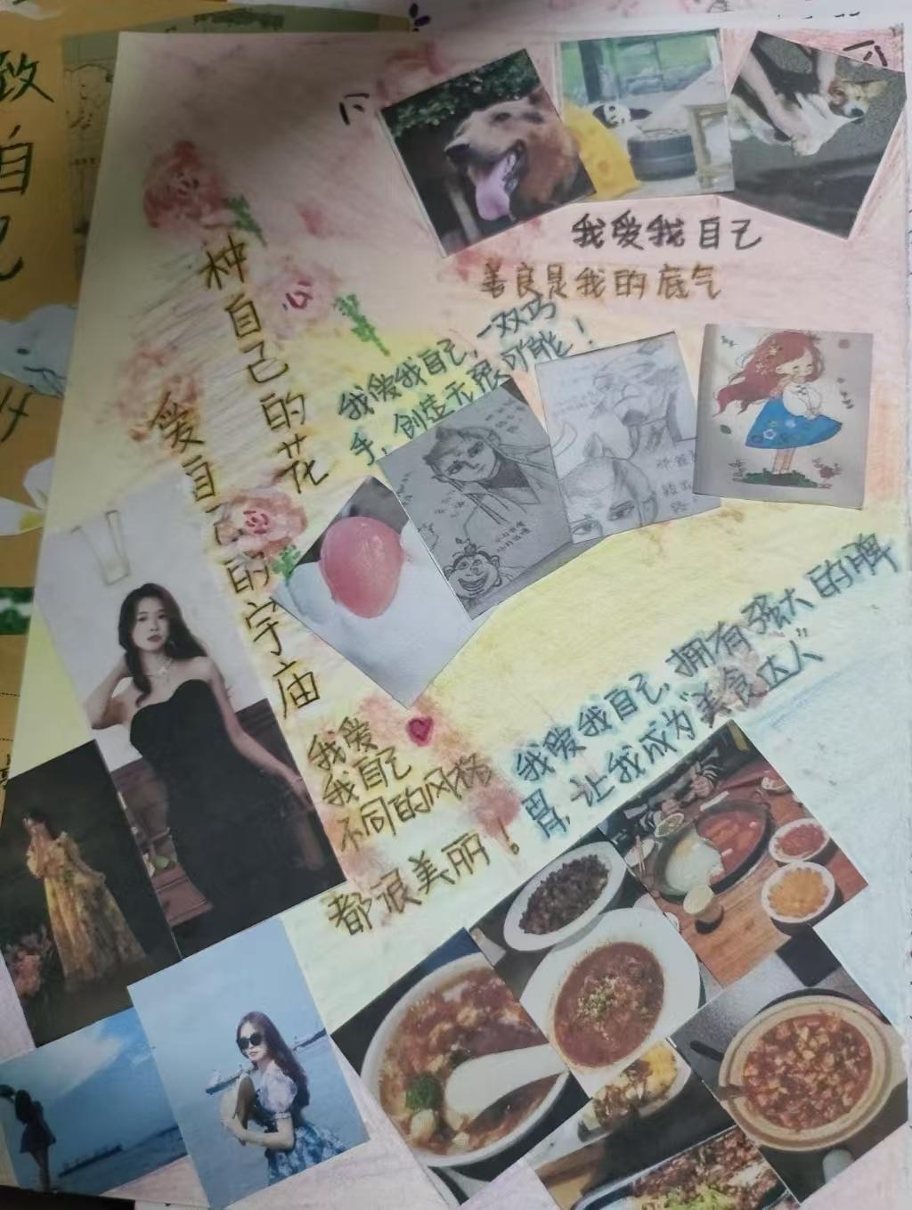 本次活动,包含“心灵故事”分享和“我爱我”感谢卡设计两个活动。活动一经发布同学们热情高涨,投身于这场心灵之旅。他们以文字、照片、视频的形式,生动分享他们在大学生活中的心理成长故事和情绪调节经验,其内容涵盖应对学习压力、调节情绪、缓解焦虑、建立良好的人际关系等方面。同时,同学们使用贴纸、彩带、印章等装饰制作精美卡片,附上细腻的文字,表达对自己的关怀、感谢和祝福,展现独特创意和真挚情感。活动结束后,同学们纷纷表示,不仅收获了心理健康知识,还增强了同学之间的情感联系,感受到了集体的温暖和力量。