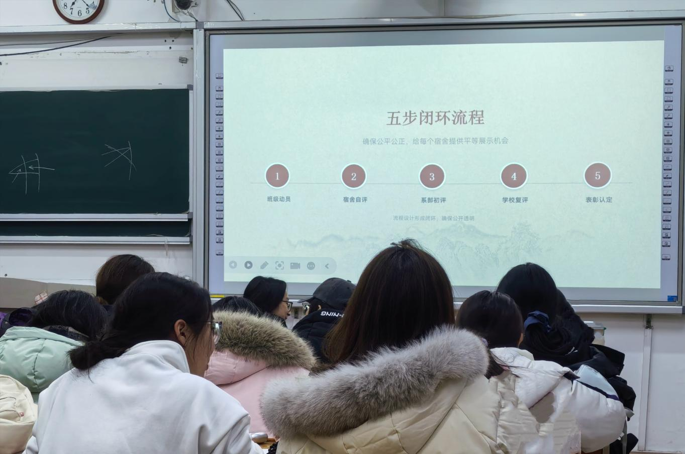 班会上,辅导员们围绕活动背景、五星维度标准、申报流程等内容展开讲解,以《星级宿舍评选办法》为依据,聚焦思想道德、安全秩序、行为文明、卫生整洁、学风优良五大维度,详细拆解“班级动员—宿舍自评—系部初评—学校复评—表彰认定”的五步流程,强调评选的公平性与规范性,并说明综合测评加分、集体表彰等激励政策以及违纪否决的约束机制,让各项规则在同学们面前一目了然。